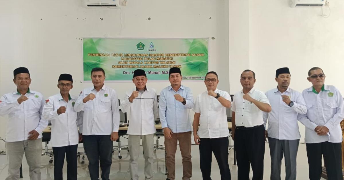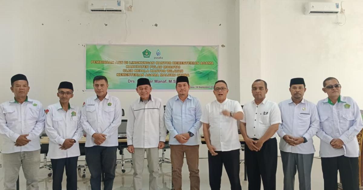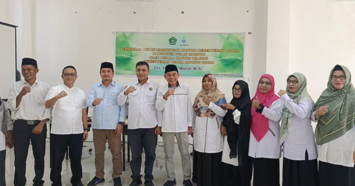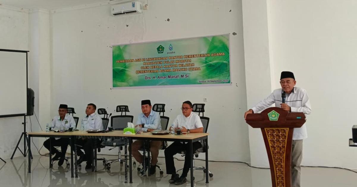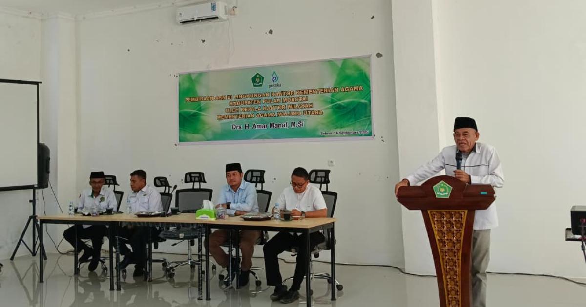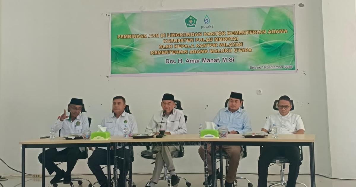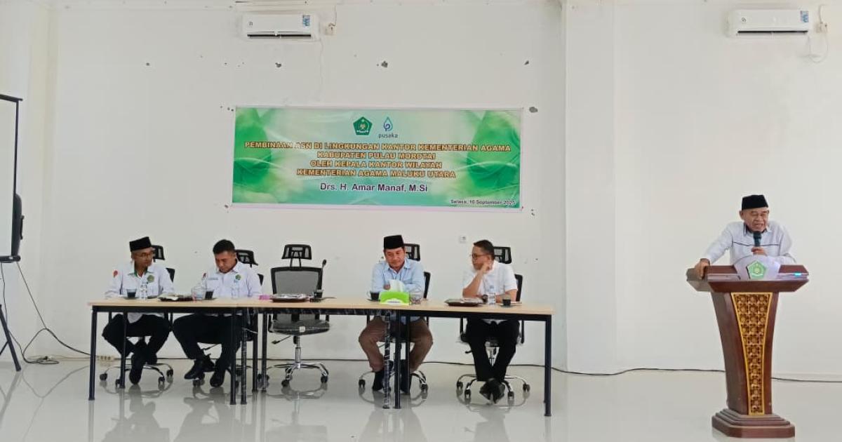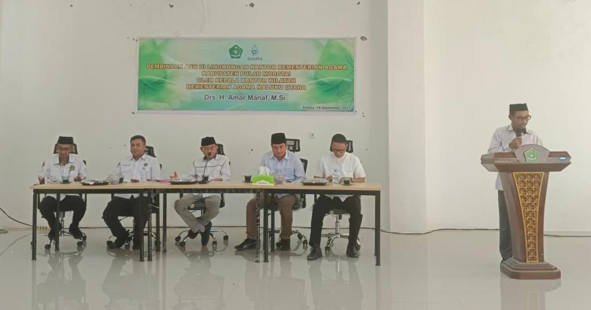 Morotai – (Humas Kemenag Morotai – Kepala Kantor Wilayah Kementerian Agama (Kakanwil) Maluku Utara, Drs. H. Amar Manaf, M.Si., menegaskan pentingnya peningkatan iman dan takwa (IMTAQ) bagi ASN Kemenag Kabupaten Pulau Morotai. Pesan itu disampaikannya saat memberikan pembinaan ASN di Aula Gedung Penyelenggaraan Haji dan Umrah Terpadu (PLHUT) Selasa, (16/9/2025) pagi.