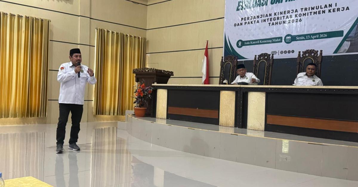 MOROTAI — (Humas Kemenag Morotai) — Kepala Kantor Kementerian Agama Kabupaten Pulau Morotai, H. Abdurachman Assagaf, S.Ag., M.Pd.I, memaparkan capaian kinerja Perjanjian Kinerja (Perkin) Triwulan I sekaligus evaluasi Program Implementasi Kinerja Kementerian (PIKK) Tahun 2026 dalam forum evaluasi di Aula Kanwil Kemenag Provinsi Maluku Utara, Senin (13/4/2026).