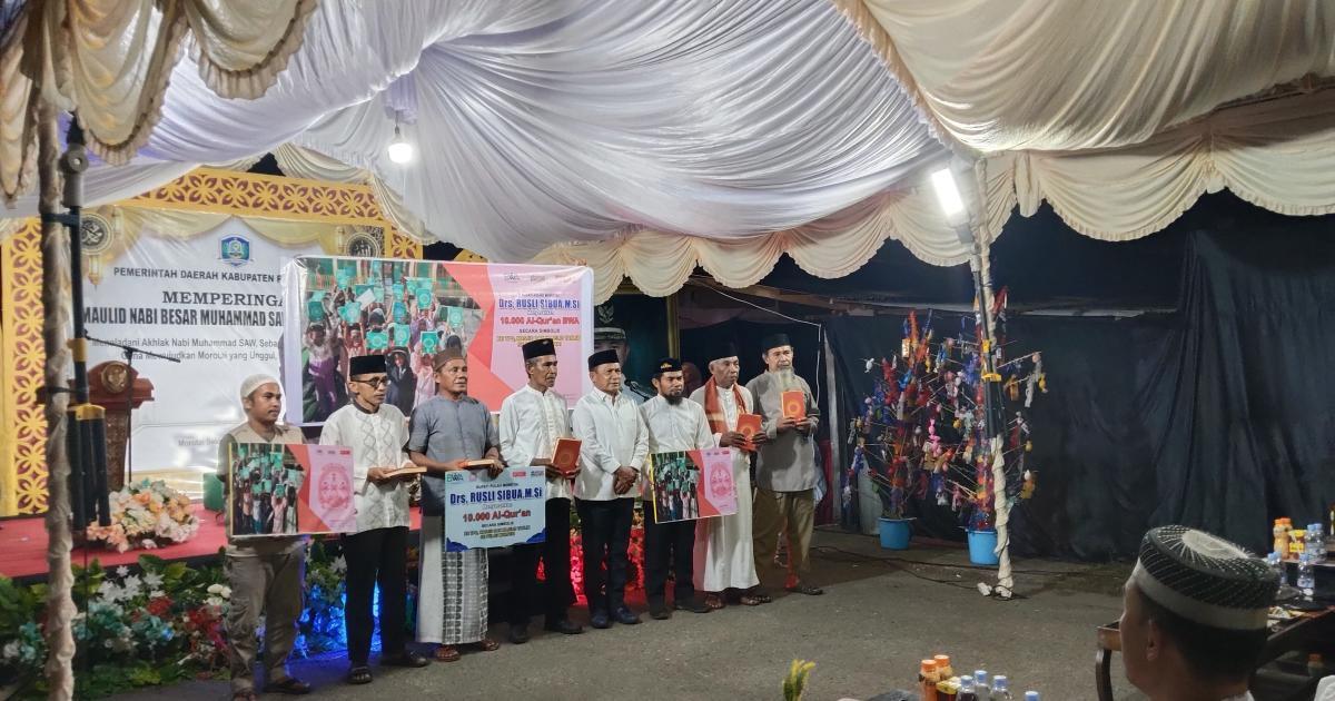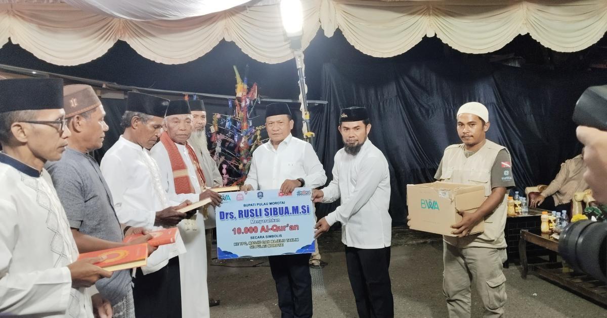 Puncak acara ditandai dengan penyerahan 10.000 mushaf Al-Qur’an oleh Bupati Pulau Morotai, H. Rusli Sibua, kepada TPQ, masjid, dan majelis taklim se-Morotai. Dalam momen itu, Bupati didampingi oleh Ustadz Suaib Marjan, S.Pd., M.Pd., penyuluh agama Islam sekaligus Koordinator Badan Wakaf Al-Qur’an (BWA) Kabupaten Pulau Morotai. Penyerahan mushaf ini, meski simbolis, mengandung makna filosofis, cahaya wahyu perlu terus dihadirkan, bukan sekadar untuk dibaca, tetapi untuk dihidupkan dalam perilaku sosial.